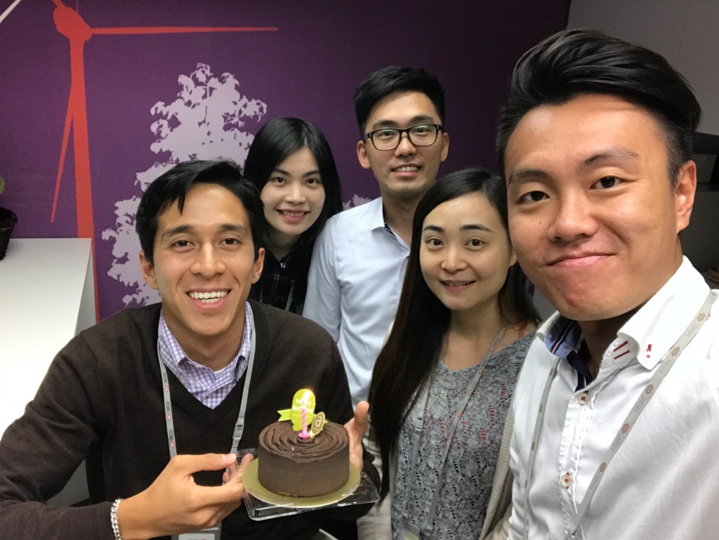 Celebrating my first birthday in Hong Kong with my new colleagues. Ace holds the phone.