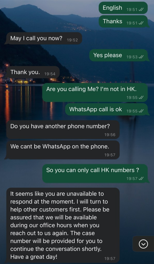 Two days before, while I was exploring Tokyo Skytree area, I thought I should stay one more night in town, as my experience so far had been great, and I didn’t have any important plans back in Hong Kong. I contacted the airline via WhatsApp and we were about to complete the new booking, but the operator couldn’t call me as I was using travel SIM. She said she had to speak to me on the phone so I provide my credit card information. When I told her that I wasn’t in town (they should know as I had taken their flight to Tokyo), she sent me to the automated bot. I was annoyed because this usually happens when there’s no response, but there was less than a minute between her message and the bot’s message.